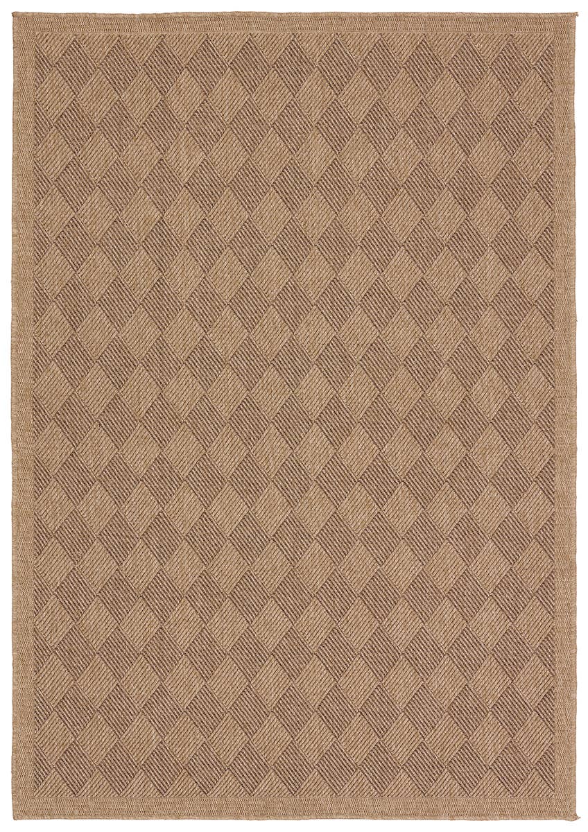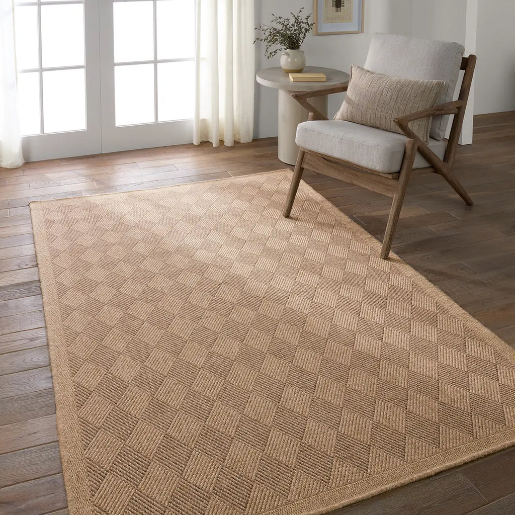 Grounding and impressively versatile, the Nambe collection features a durable, weather-resistant quality that mimics flatwoven natural looks. Emanating the classic colors of grass fibers, this assortment of indoor-outdoor rugs boasts a warm neutral palette. The Amanar rug features a checkboard design and matching border in various brown tones.