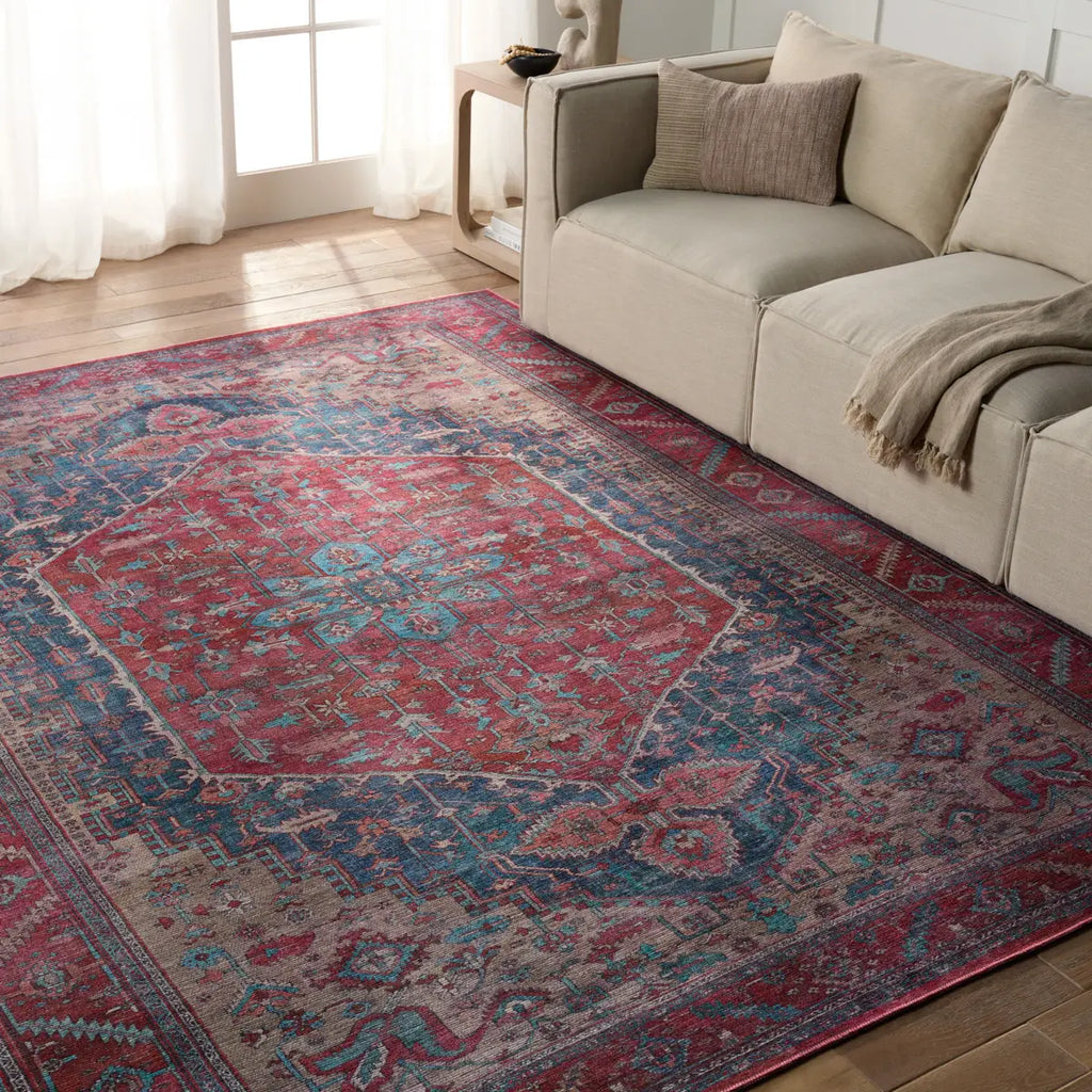 The Vindage collection melds vintage inspiration with on-trend colorways and durability for lived-in spaces. This digitally printed assortment features deep, rich tones and stunning abrashed designs that lend heirloom style to any home. The Fairbanks area rug depicts a distressed medallion pattern with floral detailing in rich tones of red, blues, and beige. The easy-care design withstands pets, children, and high traffic areas of the home such as living rooms, dining areas, kitchens, and bathrooms.