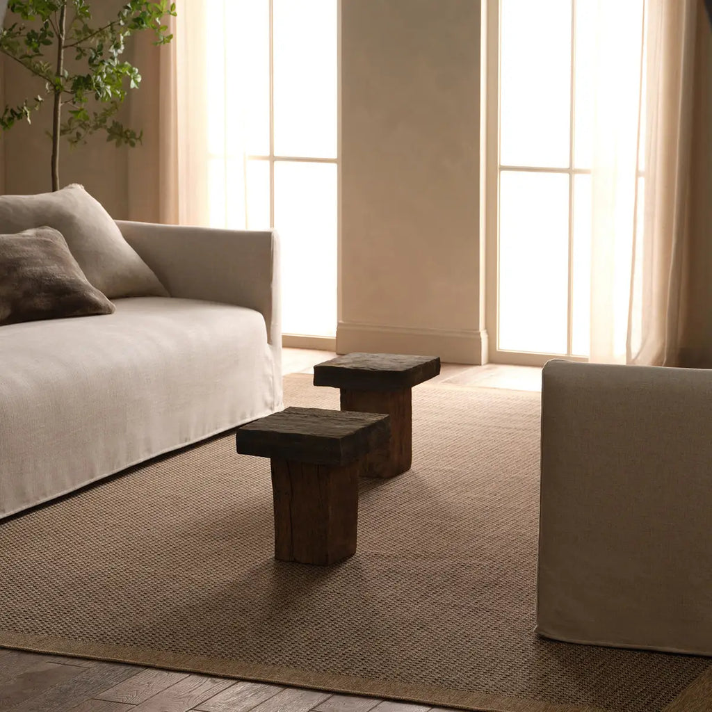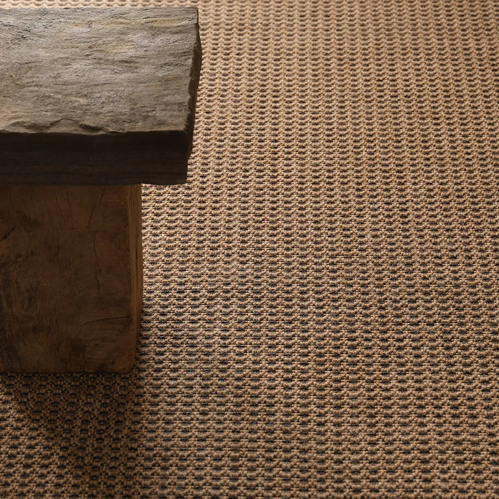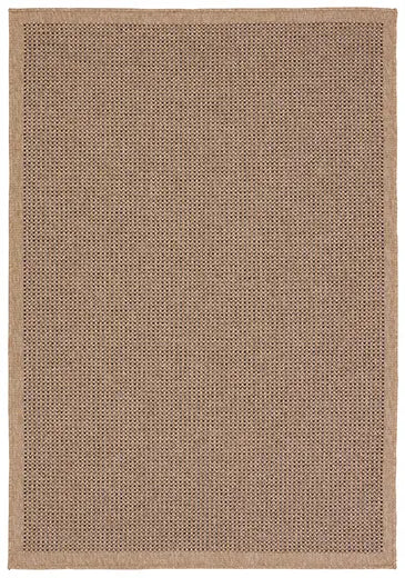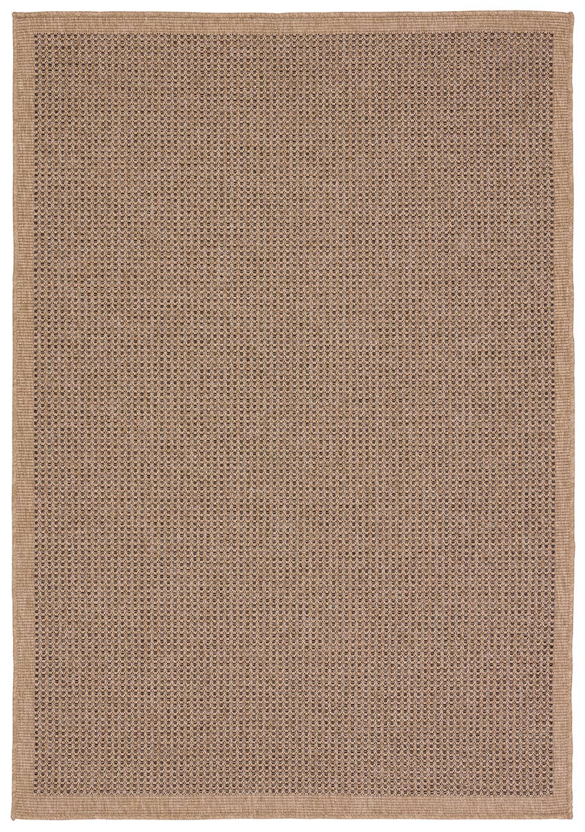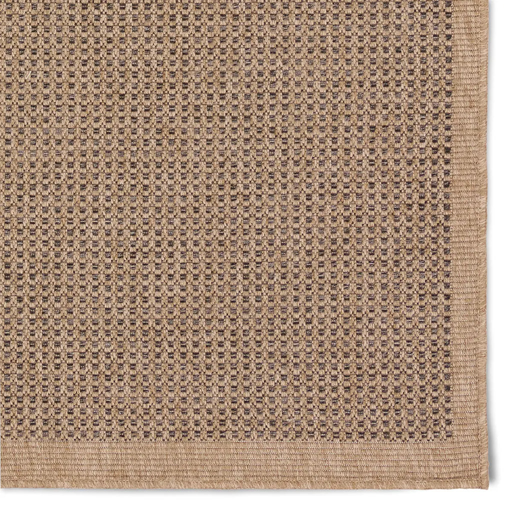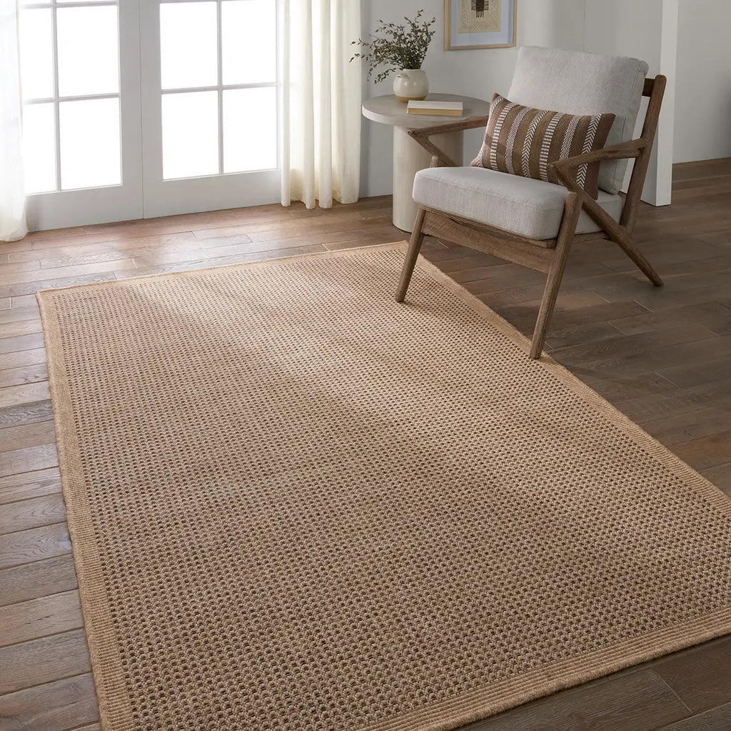 Grounding and impressively versatile, the Nambe collection features a durable, weather-resistant quality that mimics flatwoven natural looks. Emanating the classic colors of grass fibers, this assortment of indoor-outdoor rugs boasts a warm neutral palette. The Kidal rug features a solid brown design and matching border with undertones of black, and gray.